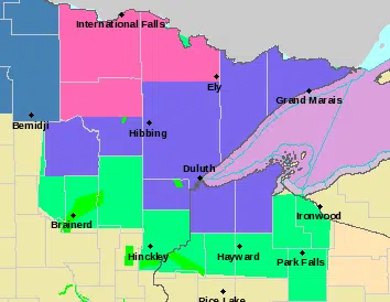 North central Minnesota, including International Falls and Ely, has a Winter Storm Warning through 1 p-m Friday for up to a foot of new snow.